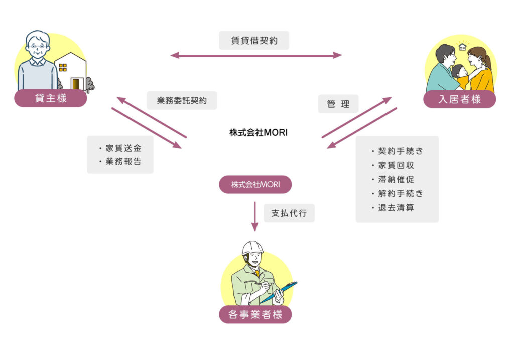 当社が貸主様に代わって運営・管理業務を行います。賃料の滞納、日常管理の手間、各種クレームなどすべての業務を代行します。また、家賃保証会社の利用によりキャッシュフローも安定します。
